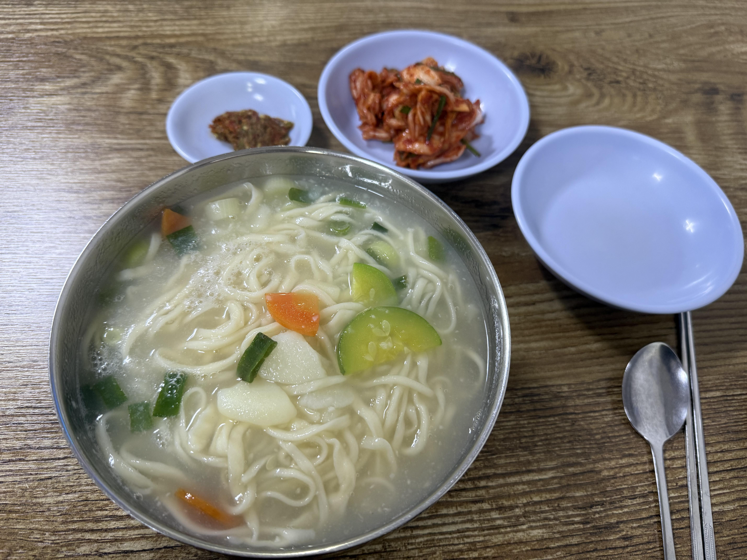 칼국수는 (아마도) 사골 베이스 육수에 전분이 들어갔는지 감자 때문인지 적당히 된 느낌의 국물입니다.
