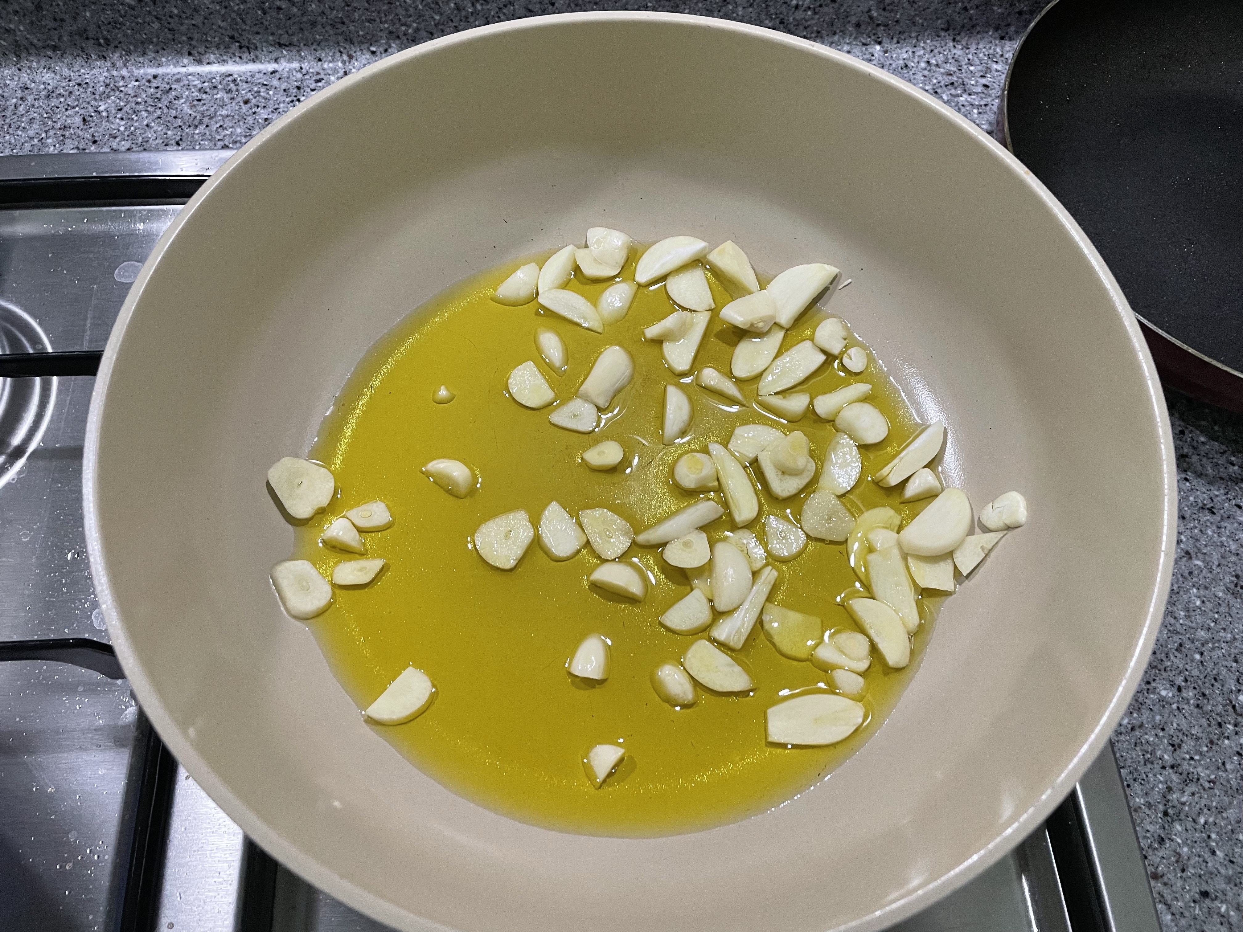 매우 약불로 오일에 마늘향을 입힌다는 느낌으로 천천히 가열해준다.
