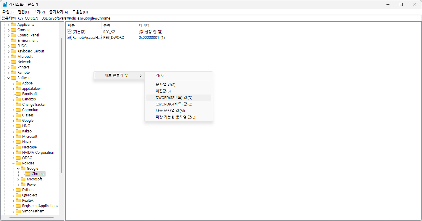 HKEY_CURRENT_USER\Software\Policies\Google\Chrome 경로에