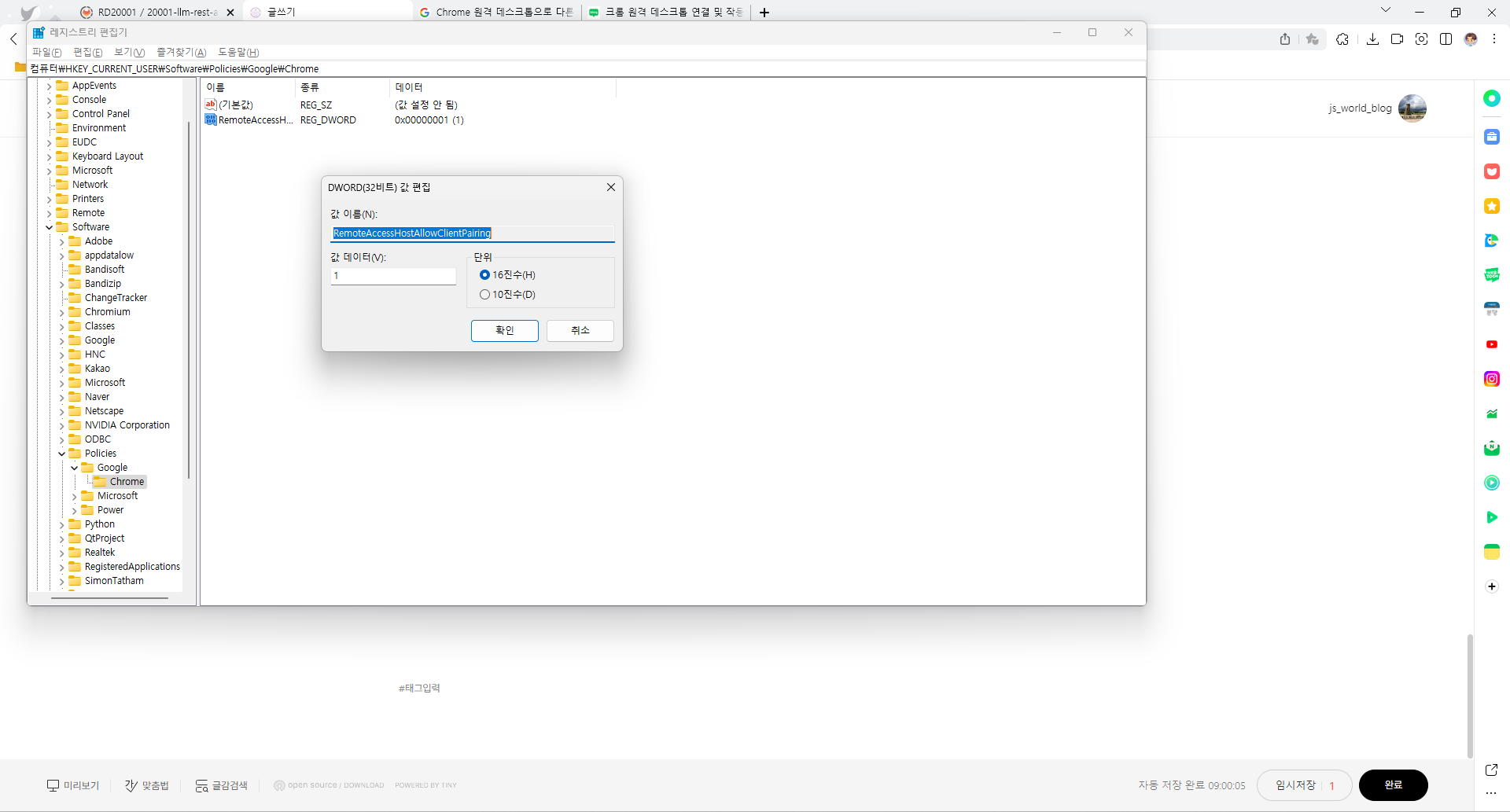 위에서 해본 두 가지 방법에도 진전이 없어서 세 번째 원인으로 정책문제를 생각해 보게 되었습니다. 구체적으로 어떤 정책인지 찾은 건 없으나, 오랜 구글링 끝에 구글 리모트 데스크톱의 정책을 추가해주어야 한다는 글을 보고 해 보았습니다.